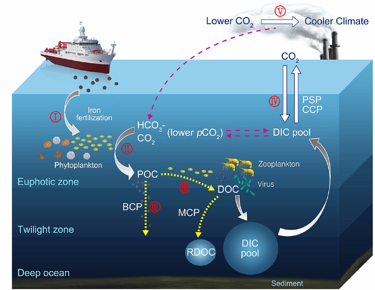 图2. 海洋初级生产力、海洋铁施肥与气候变化的关系示意图,以及海洋铁施肥实验实现调控气候变化的五个关键过程。所使用的缩写包括BCP(生物碳泵)、MCP(微型生物碳泵)、PSP(物理溶解度泵)、CCP(碳酸盐对抗泵)、RDOC(惰性溶解有机碳)和DIC(溶解无机碳)。