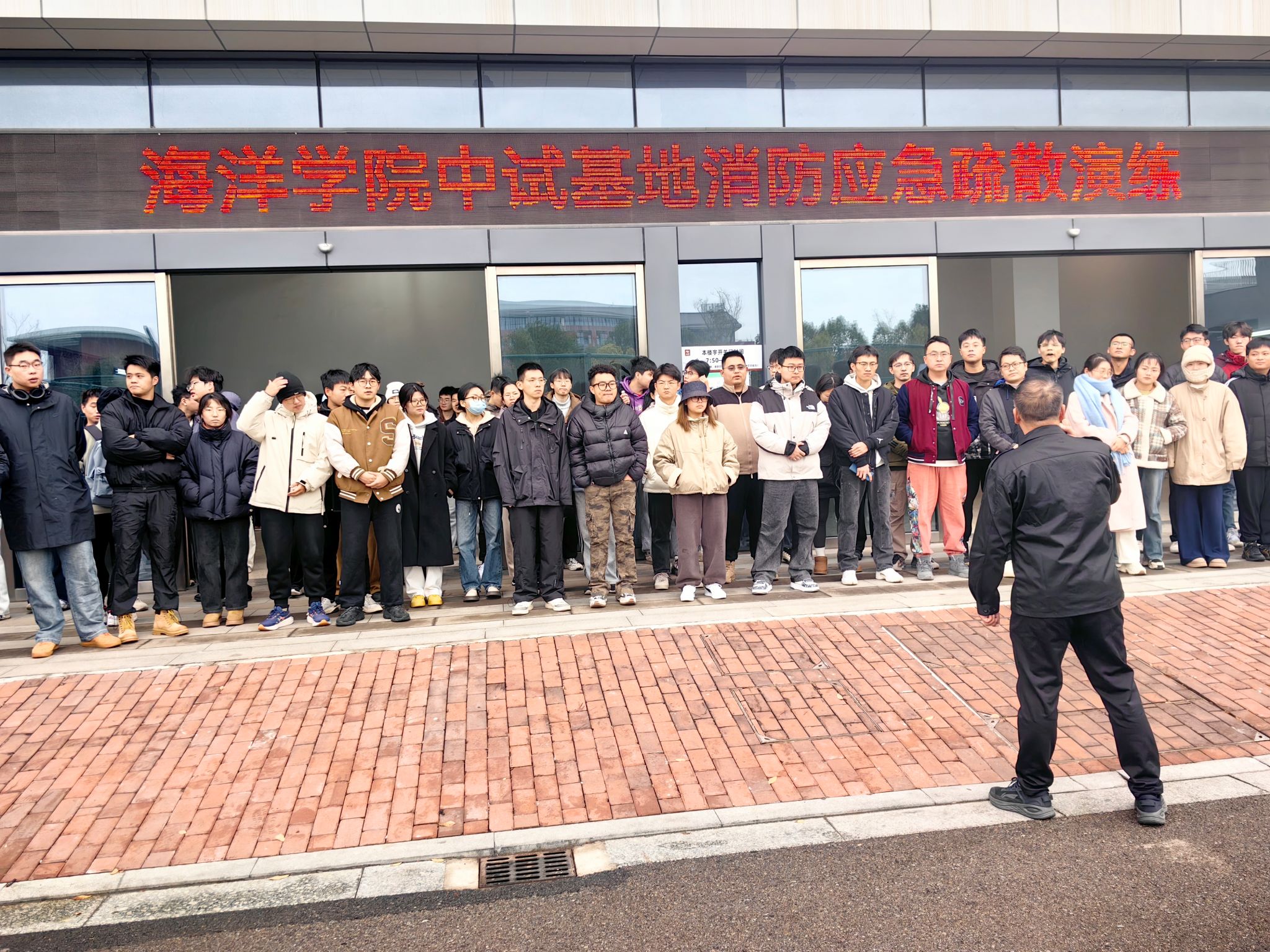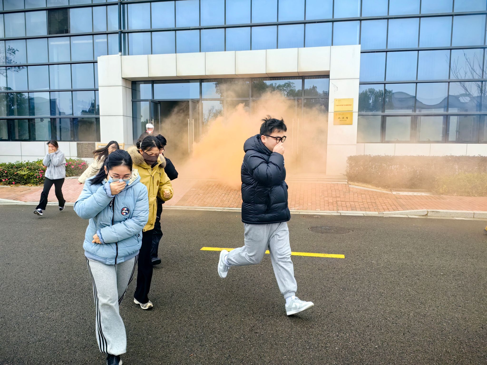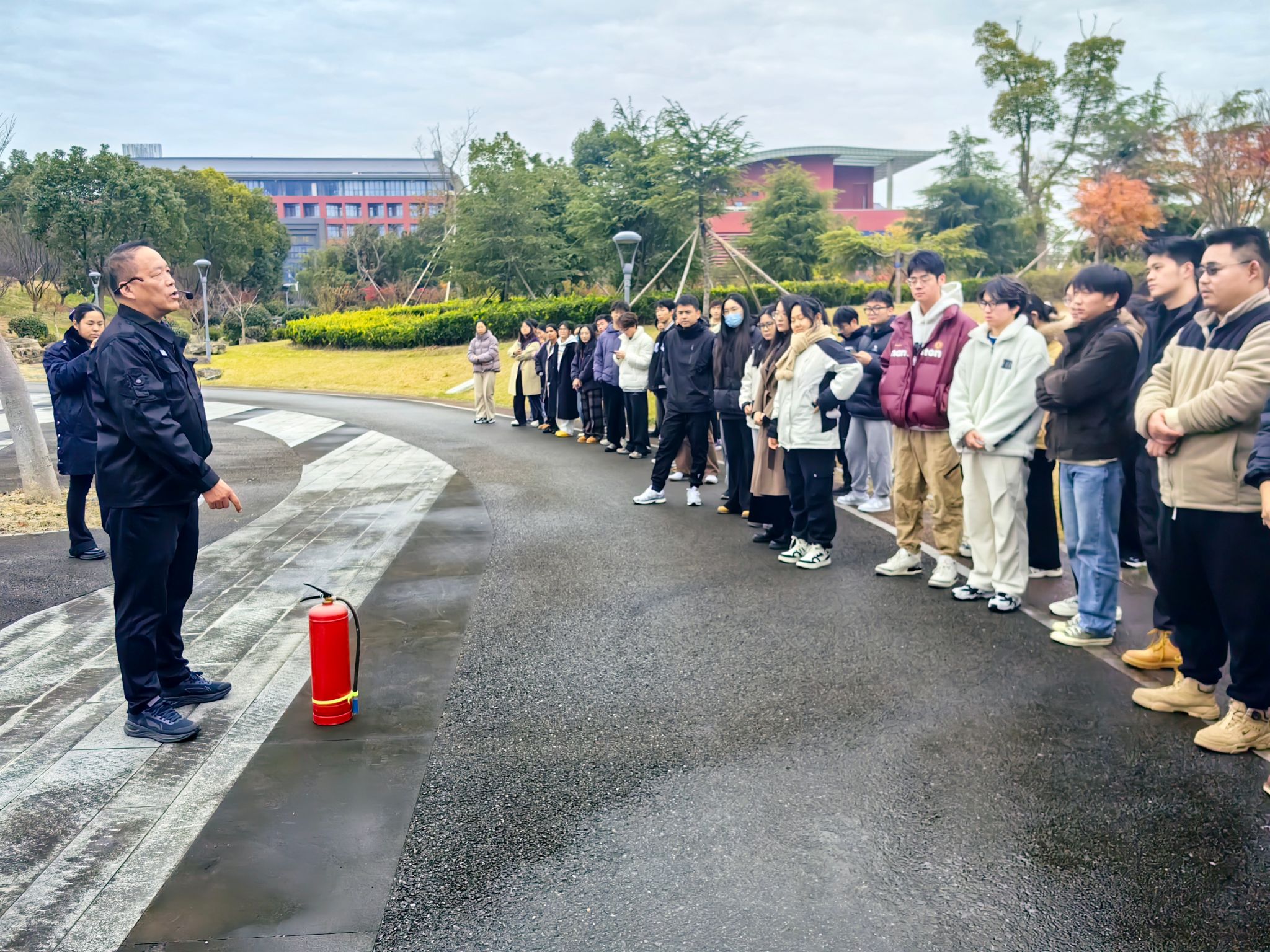 首先,保卫部陈红军老师对学生进行消防相关知识讲解。包括消防器材的分类、消防器材的正确使用及火灾发生时的应急逃生,重点强调火灾发生后的处理和应急逃生要领。科普了干粉灭火器和二氧化灭火器的使用场景,着重强调二氧化碳灭火器使用时,不能用手直接接触,需佩戴手套防止冻伤。随后,陈老师指导大家开展现场应急消防演练。中试基地一楼模拟了火灾事故发生的情景,参与演练的全体人员到达指定岗位。随着大楼烟雾警报响起,在场学生迅速反应,捂住口鼻,从基地大门迅速撤离。到达制定地点后,马上清点学生人数,向现场负责人汇报,整个疏散过程指挥有序,无一人遗留在大楼。演练结束后,组织学生逐一进行灭火演练。