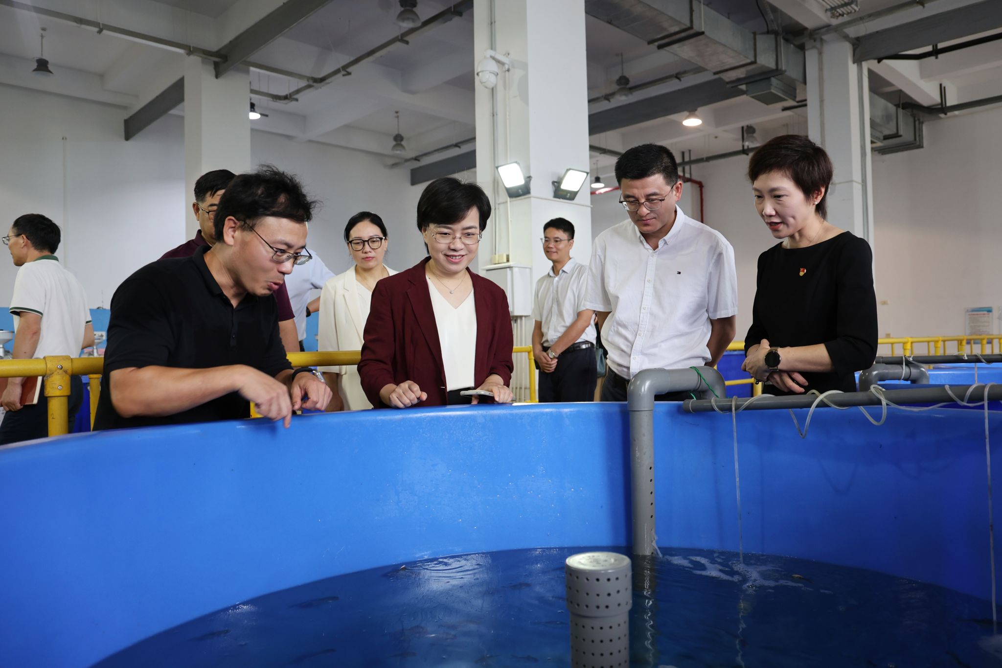 张瑞丽一行首先来到学院中试基地,实地察看了银鲳、青蟹等海鲜养殖情况,并参观了院史馆和海洋生物标本馆,对学院学科发展进行深入了解。在调研座谈会上,张瑞丽认真听取了学院在党建引领、学科建设、地方服务等方面的工作汇报,以及学院班子对于省水产登峰学科建设的发展建议。张瑞丽对午夜av