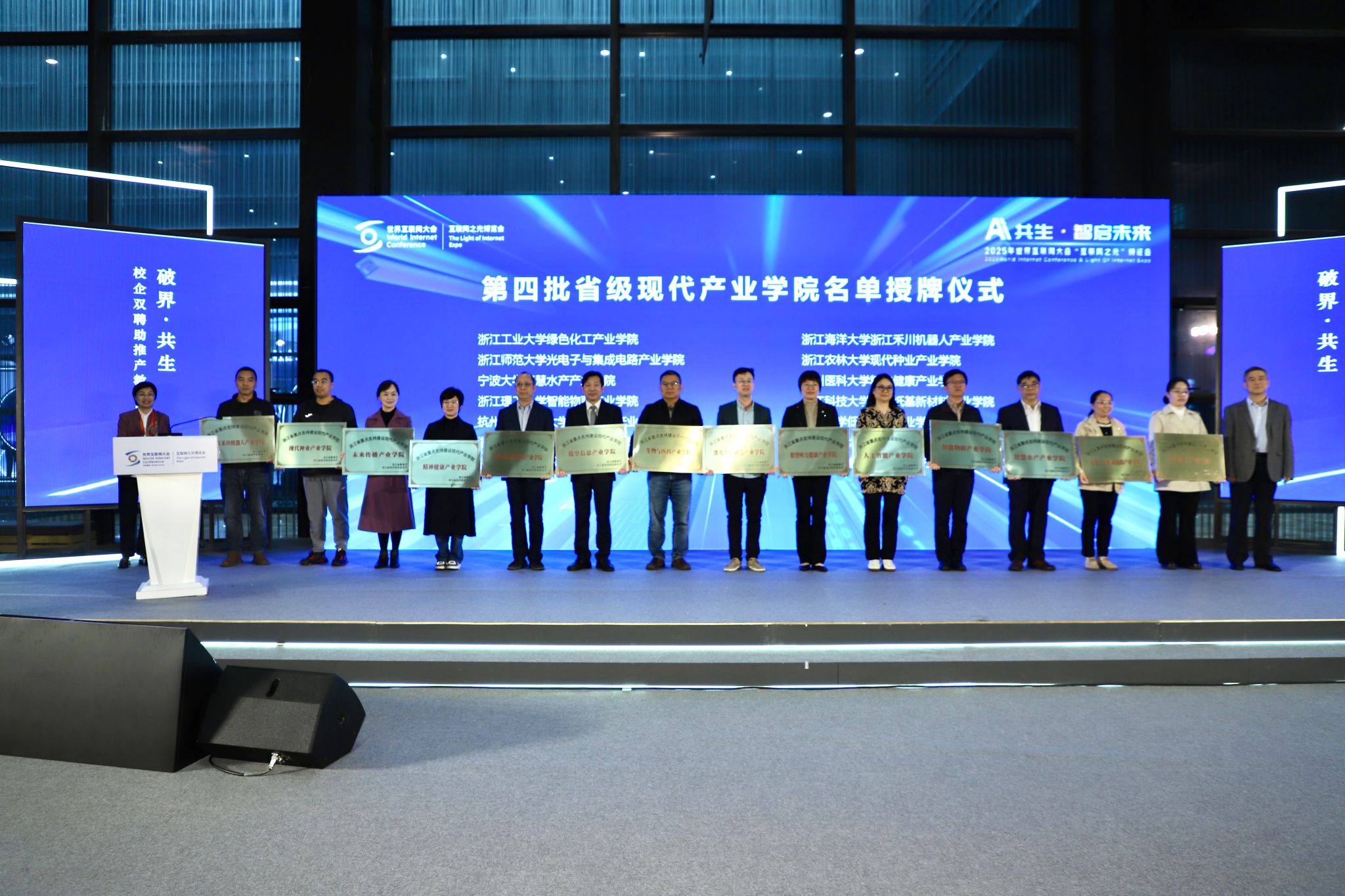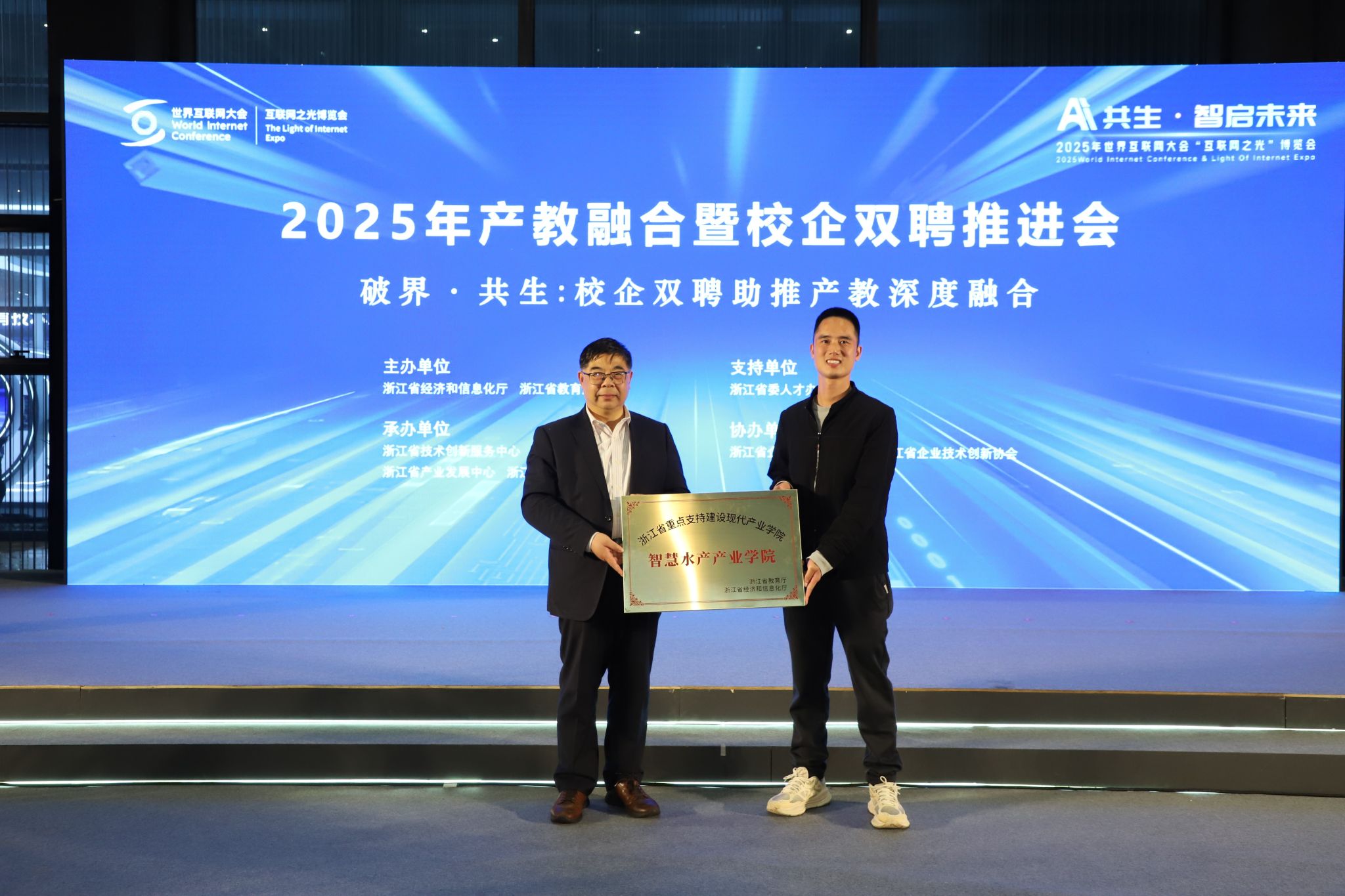 本次推进会由浙江省经信厅、省教育厅联合主办,以“破界・共生:校企双聘助推产教深度融合”为主题,聚焦人才培养与产业需求衔接、校企资源高效联动等核心问题。活动现场举行了第四批省重点支持建设现代产业学院授牌仪式,分享了校企双聘、产业教授等机制的实践经验,并组织参观了产业人才招聘会与“互联网之光”博览会。