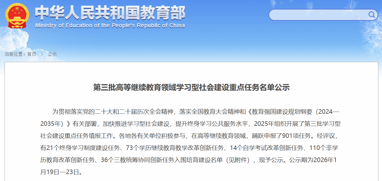 近日,教育部公布第三批高等继续教育领域学习型社会建设重点任务名单,午夜av