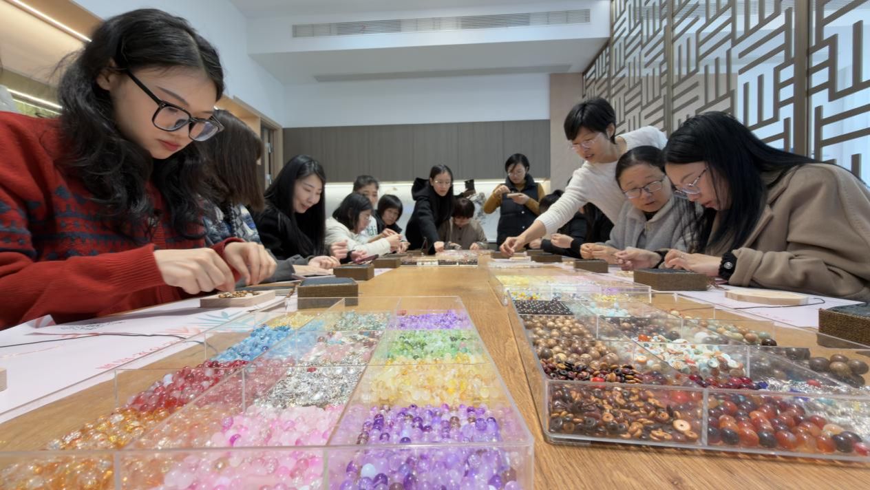 分工会在学院人才之家精心策划了“珠光流转映匠心·指尖雅韵绽芳华”主题手串DIY活动。学院30余名女教工齐聚一堂,以海洋文化为灵感,亲手制作独具匠心的水晶、菩提子等各种材质的手串,在创意手作中感受节日温情与艺术之美。