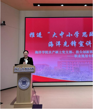 水产硕士第一党支部书记余杰老师详细介绍了本次活动的目的,他表示,活动立足海洋学科特色,通过微党课宣讲与职业经验分享,引导青年将个人成长融入海洋强国、乡村振兴战略,在职业追求中践行初心使命。海洋先锋宣讲团成员、2026年“宁大潮音”思政微课大赛一等奖获得者周紫琰带来题为《做一粒好种子,在新时代的盐碱地上垦荒》的微党课。宣讲团成员李斌、李本镇、郭梦迪结合自身经历,分别围绕考博、企业求职和考公务员三个方向,为同学们分享了实用经验与成长心得。