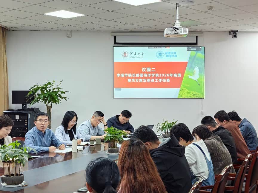 张乐副书记首先传达了学校就业工作相关会议精神与具体要求,她指出就业是最大的民生工程、民心工程和根基工程,毕业生高质量充分就业不仅是检验人才培养质量的试金石,更关系每一位同学未来的发展以及每个家庭幸福的头等大事。学工办主任王腾飞汇报了学院2025届毕业生及用人单位满意度调查情况以及2026年高质量充分就业工作方案,通报了各毕业班就业落实进度,分析面临的困难和挑战并提出主要工作举措。李成华院长围绕当前就业形势与学院发展目标,强调全体教师要深刻认识就业工作的重要性,将其作为当前学院重点工作抓实抓细;要自觉把就业工作贯穿到人才培养的全过程,了解学生的个性化需求,帮助设定最适合学生的职业发展路径;要用心用情提升就业服务质量,用自己的经验切实解决其求职过程中的实际难题;要鼓励学生将个人发展融入国家需求,扎根基层生产一线,讲好服务“海洋强国”“乡村振兴”等国家战略的精彩故事。