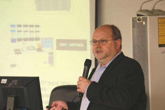 格雷厄姆·琼斯教授还对个人研究方向做了具体汇报,其早期研究方向主要是治疗技术的研发工作,方向是运用化学合成技术来进行针对于特定生物和临床靶点的药物和影像介质准备。格雷厄姆·琼斯教授推动了新型抗癌药物、急性髓性白血病治疗药物、多聚谷氨酰胺异常治疗药物的研发。参与前药和影像介质研发、PEF影像标记物18F研发、阿尔兹海默症检测技术以及仿生氧化研究等多项科研工作。受邀参加临床研究数据分析,美国食品药品监督管理局关于生物仿制药定性的听证会等,科研经历及阅历极为丰富。
