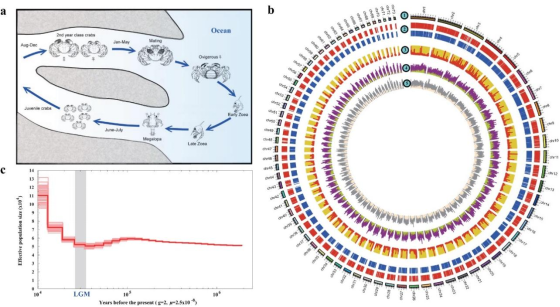 中华绒螯蟹(Eriocheir sinensis)俗称河蟹、大闸蟹,环境耐受力广、扩散能力强、繁殖力高,具有重要的经济价值及生态意义。河蟹大部分时间在淡水中生长,成体到海水中交配、抱卵、孵化,孵出的幼体一直在海水中发育至大眼幼体阶段。大眼幼体经淡化后变成仔蟹,又回到淡水中直至成体。中华绒螯蟹基因组中存在大量简单重复序列(SSR)和富含GC碱基的区域(GC-rich regions,>60%),转座子变异率明显偏低,推测与近期扩张有关。重测序数据揭示,河蟹种群在末次冰盛期之后发生明显扩张。