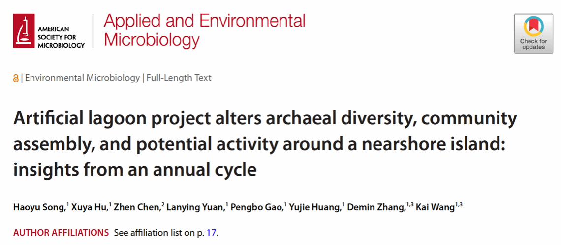 王凯教授课题组在美国微生物学会经典期刊《Applied and Environmental Microbiology》发表题为“Artificial lagoon project alters archaeal diversity, community assembly, and potential activity around a nearshore island: insights from an annual cycle”的研究论文(图1),围绕近岸生态修复中的关键工程措施——人工潟湖工程,系统揭示了其对海洋古菌群落的多维度重塑效应,为科学评估潟湖工程的生态效应提供了新的微生物学视角。