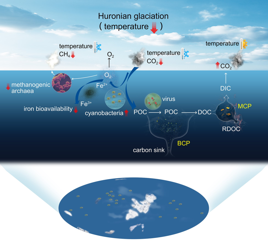 姜海波教授与美国南加州大学David A. Hutchins教授、自然资源部第二海洋研究所王云涛研究员等合作,分析了地质时期(例如大氧化事件、雪球地球事件、更新世冰期-间冰期循环)海洋初级生产者的种类和数量、海水铁可利用度、地球气温、大气CO2浓度的变化趋势(图 1),发现冰期-间冰期循环中铁的生物利用度、温度的变化趋势与铁假说一致,但是在大氧化事件和雪球地球时期,许多因子的变化趋势与铁假说是矛盾的。例如在休伦冰河期(24-21亿年),地球经历了长达3亿年的大冰期,蓝细菌的丰度在此期间大幅增加,吸收了大量CO2并驱动了生物碳泵(biological carbon pump,BCP)和微型生物碳泵(microbial carbon pump, MCP),然而铁的生物可利用度却因大氧化事件显著下降,因此该大冰期的形成原因与铁假说相矛盾(图2),具体原因可能与产甲烷古菌的大量死亡有关。